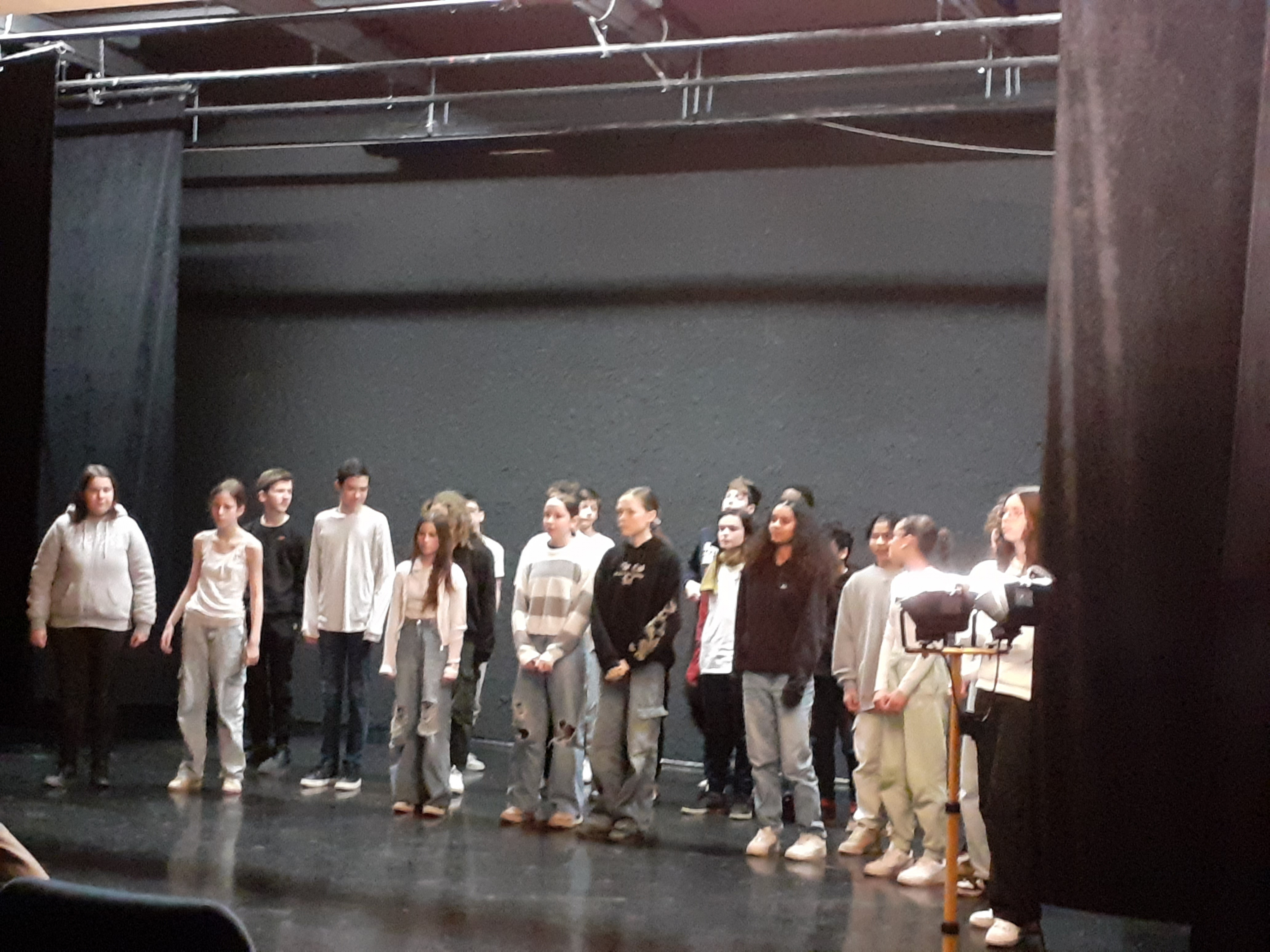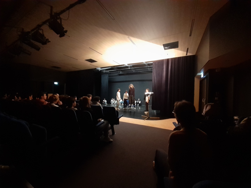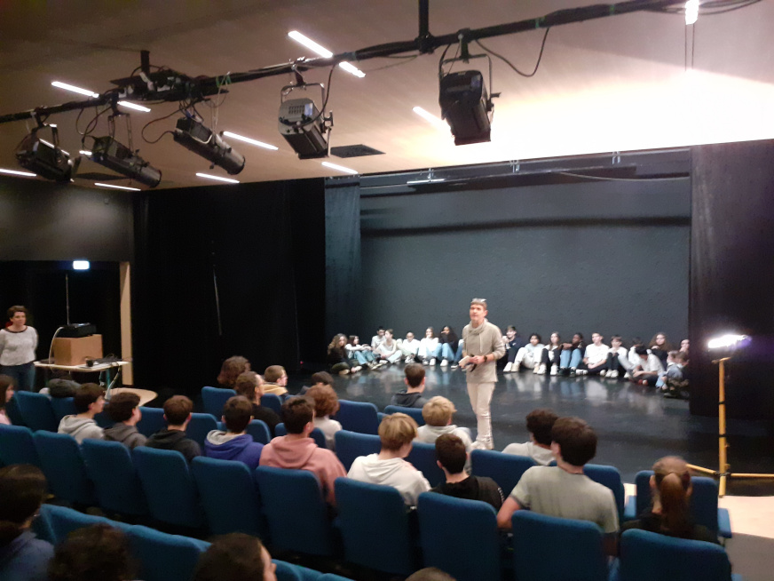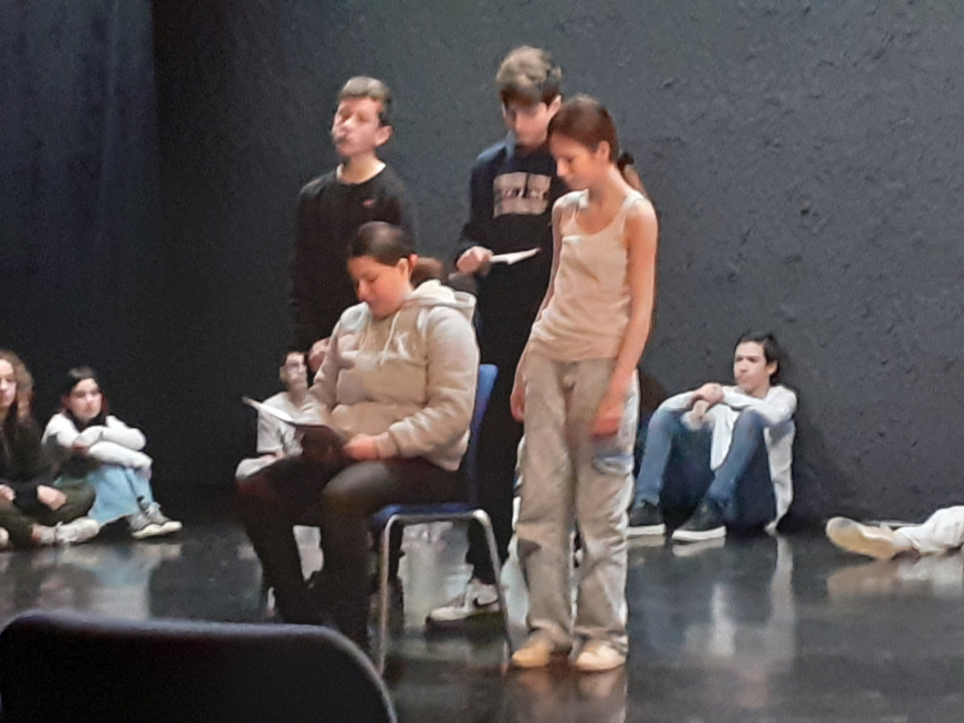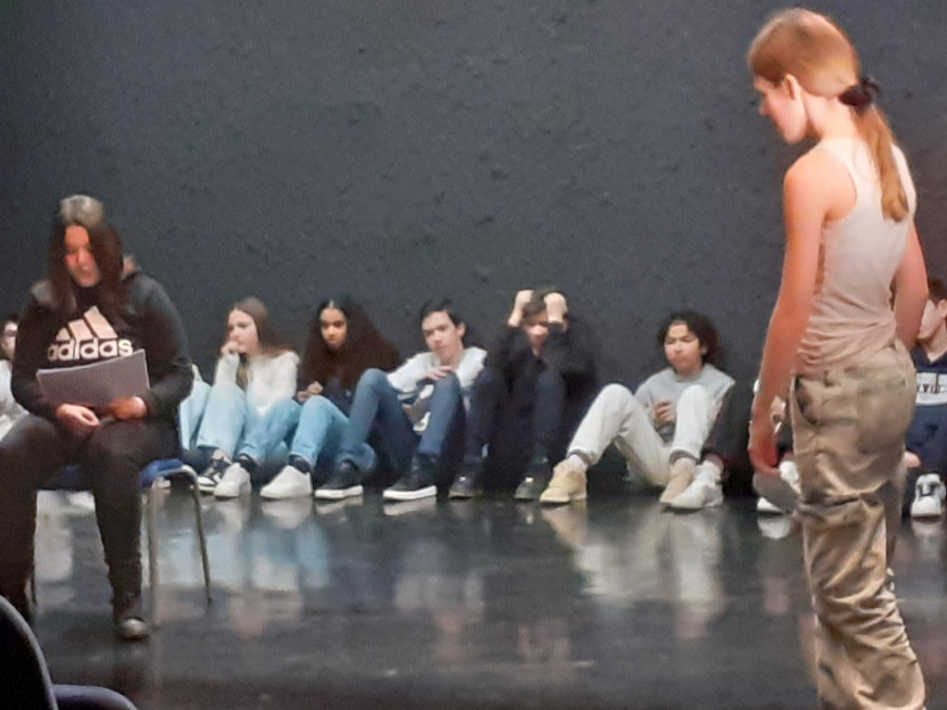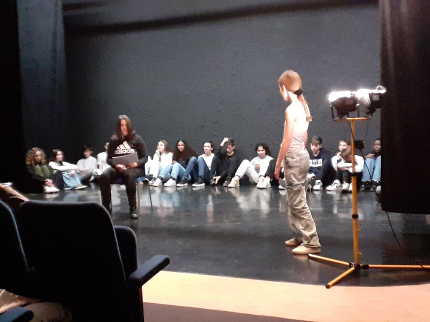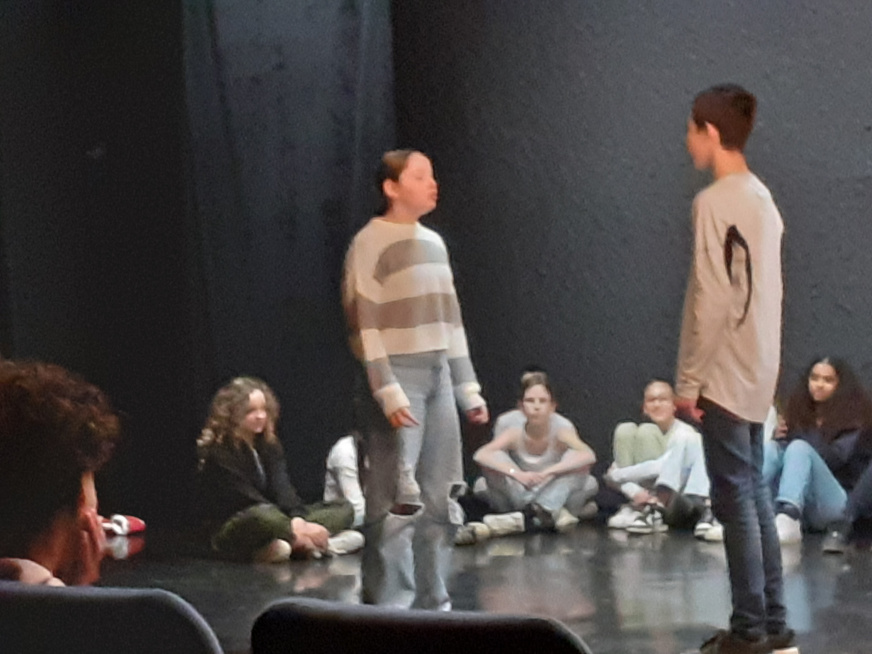 La classe a travaillé en atelier dans la nouvelle salle G. BRASSENS. Une quinzaine d’heures encadrées par l’enseignant et la comédienne. Pour boucler le projet, la pièce a été jouée devant les élèves de la 3e théâtre, des enseignants et le personnel de direction. Pour un chouette résultat.